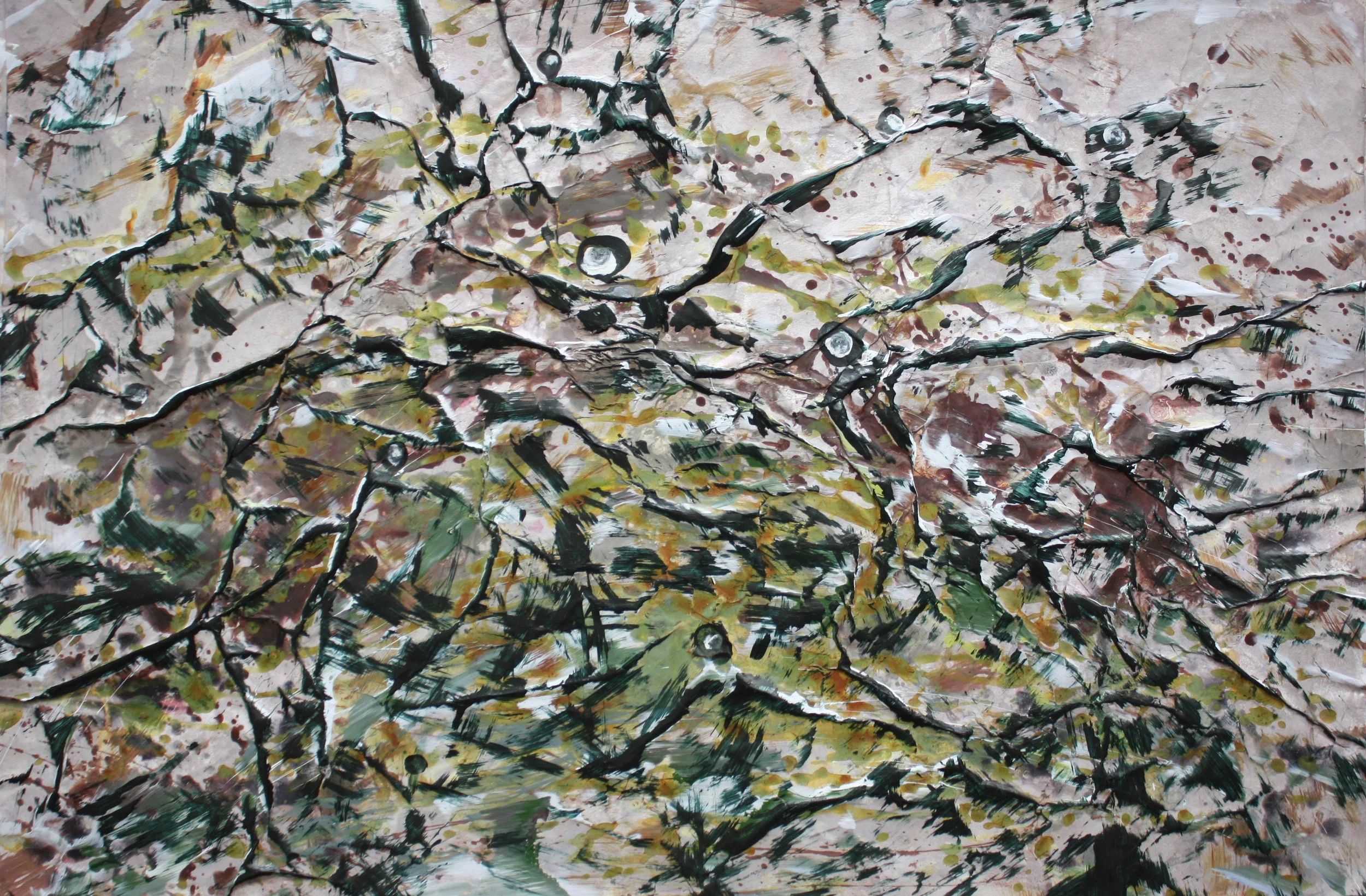 Mountain ridges, desert canyons, swells across the ocean, crumpled paper, all share some kindred qualities that inspire much of my process of painting on paper and canvas. In this series, the evocation of geological phenomena is foregrounded. The crumpled and wrinkled textures are the jumping off point for these pieces that soon venture off into lives of their own.