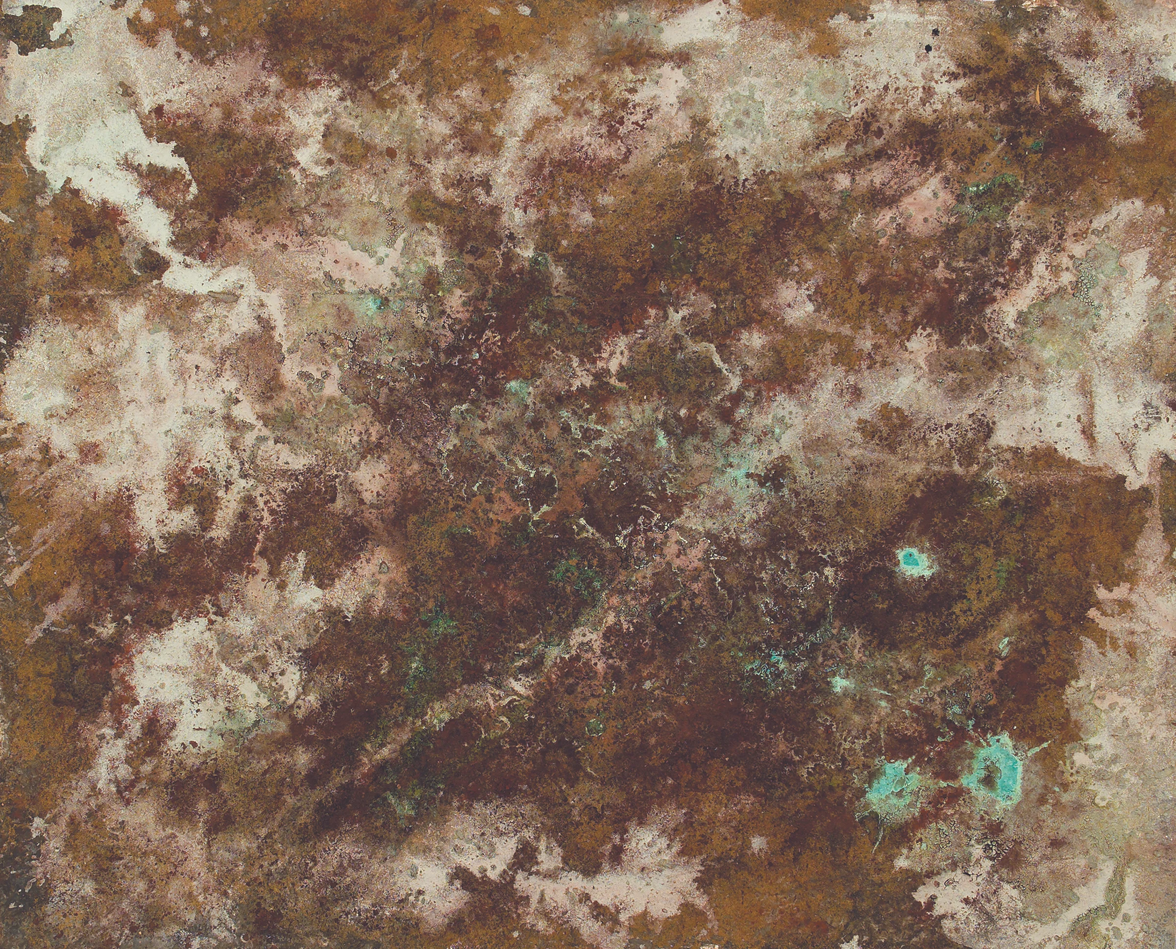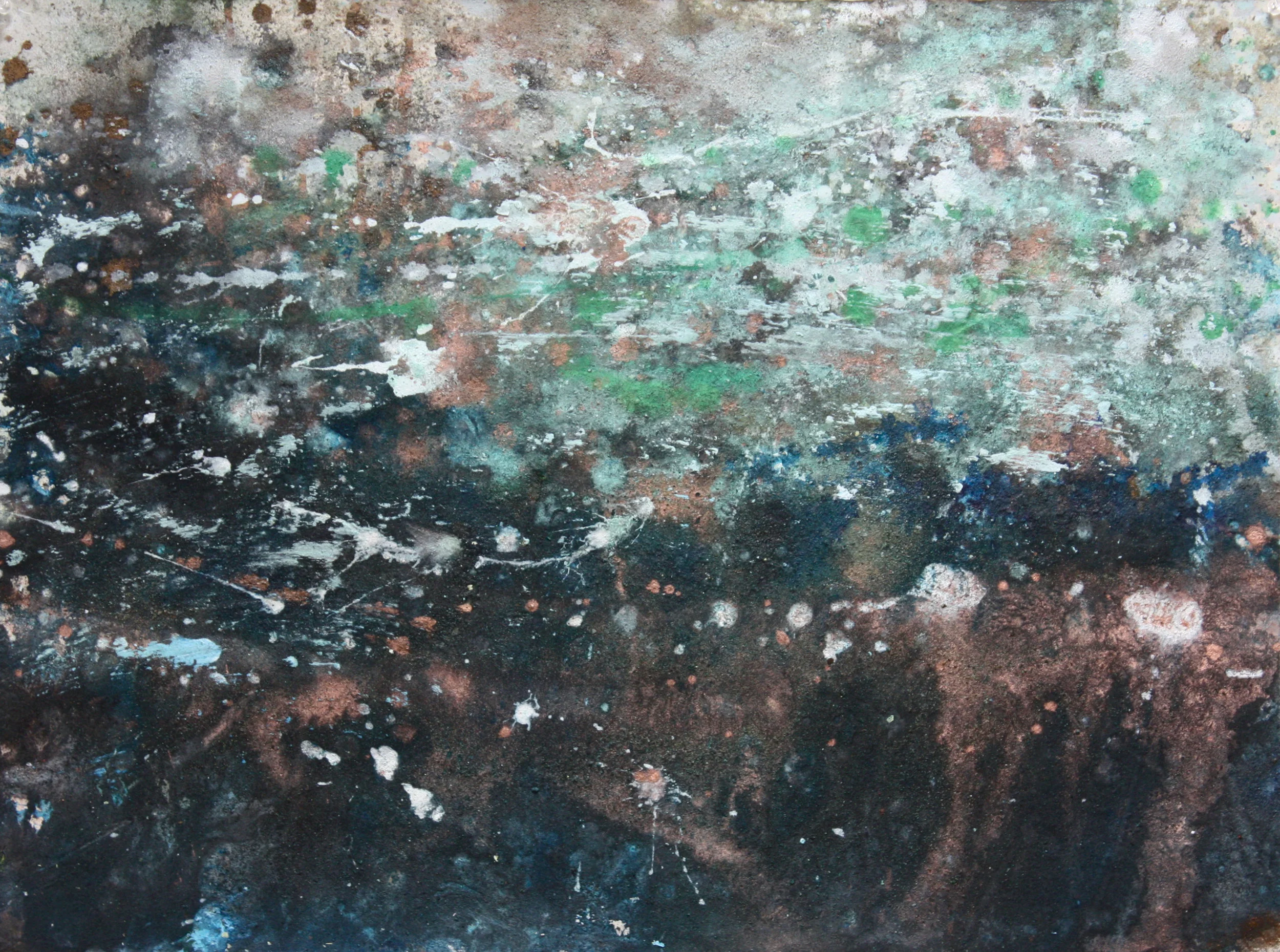 These images arise from the interaction of natural forces and human influence. In addition to painting mediums I am using earth materials such as sand, iron oxide, copper, and oxidizers. I see my role here as setting materials into motion and playing along as another force of nature, equal parts creator and observer of the evolving of the elements. Sometimes guiding, mostly delighting in the flow and changes that come about.